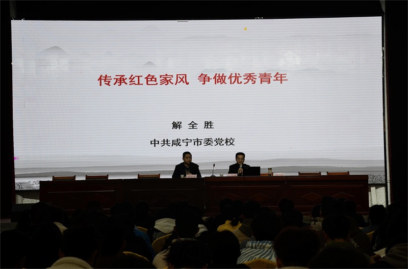 家是社会的基本细胞,家风是形成良好社会风气的重要基础。为积极响应我校技能教育周活动,更好帮助学生树立正确的职业观,立志做有理想、敢担当、能吃苦、肯奋斗的新时代好青年。2月21日上午,学院邀请中共咸宁市委党校副校长解全胜副教授以“传承红色家风、争做优秀青年”为主题开展专题讲座。讲座由2022级物联网应用技术、软件技术、计算机应用技术等专业的252位学生在大学生活动中心参加。马院书记兼院长龚斌安主持活动,副院长王翔作活动总结。