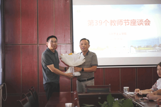 9月7日,桂花香飘校园,在第39个教师节来临之际,校党委书记高焕清专程来到国产又猛又黄又爽,慰问思政课教师,为马院教师代表常卫峰献花及合影,参加国产又猛又黄又爽教师节座谈会,对国产又猛又黄又爽全体教师送上了诚挚的节日祝福。