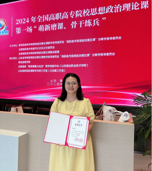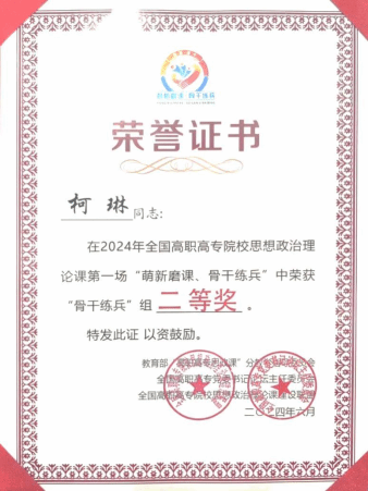 6月22日,2024年全国高职高专院校思想政治理论课第一场“萌新磨课、骨干练兵”活动在山东圆满落下帷幕。经过激烈角逐,我校思政课教师柯琳荣获“骨干练兵”组二等奖。展示了我校思政课教师扎实教学能力,是学校落实立德树人根本任务、推进思政课高质量发展的一项成果。