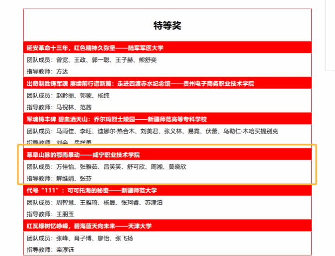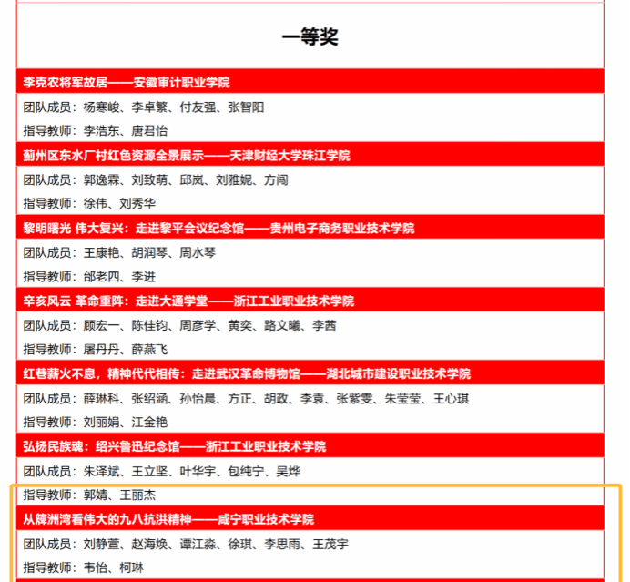 咸宁职院师生作品力夺特等奖1项和一等奖1项,这也是继2023年12月我校思政课教师王金等指导的作品《何功伟烈士纪念园》获“第二届全国大学生红色全景资源创意展示大赛”一等奖之后,再一次获得殊荣!