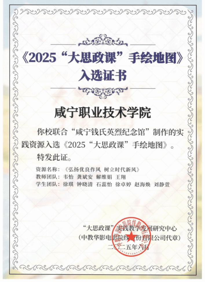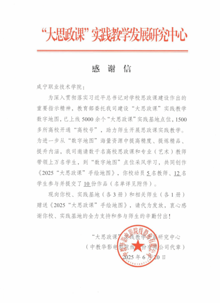 7月4日,接省教育厅思政处通知,咸宁职业技术学院联合钱氏英烈纪念馆制作的实践资源《弘扬优良作风 树立时代新风》、《家风无声 传承有道》入选教育部社科司“大思政课”实践教学发展研究中心《2025“大思政课”手绘地图》(湖北共入选八项作品)。“大思政课”实践教学发展研究中心为我校发来感谢信。