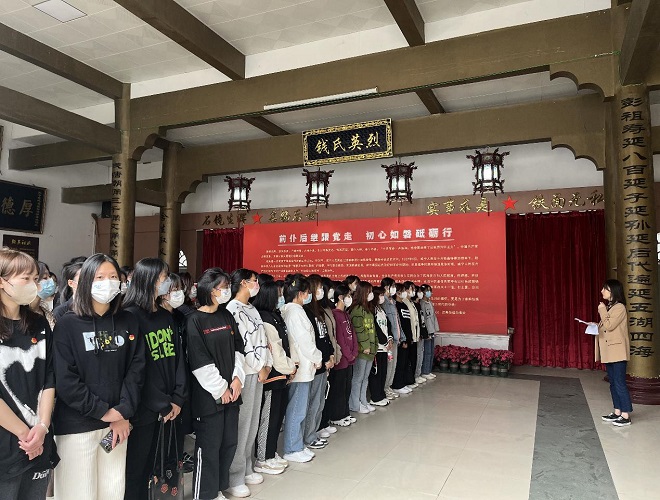 祭扫完毕后,大家来到钱氏英烈纪念馆,韦怡老师带领全体师生向钱瑛同志雕塑敬献花篮,并从“思想受洗礼,矢志报祖国;练就“不坏身”, 勇敢成斗士;正人先正己,廉洁树典范”三个层次为学生讲述了钱瑛同志的先进事迹,并叮嘱同学:要深入学习钱瑛同志身上对党忠诚、勇于斗争、铁面无私、清正廉洁的优秀品格,立大志,明大德,成大才,担大任。