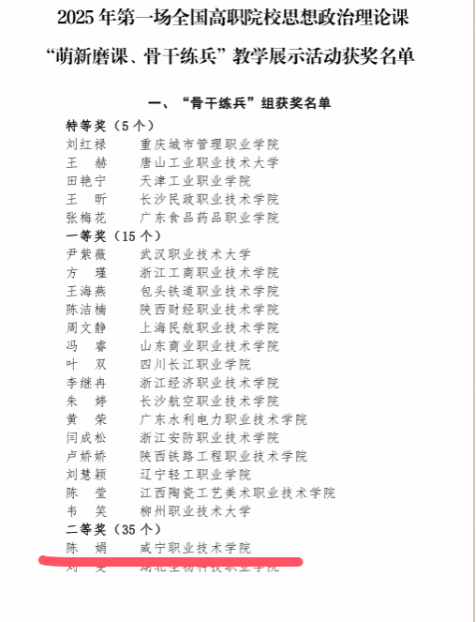 2025年3月28日-30日,由全国高职高专院校思想政治理论课建设联盟主办的2025年第一场全国高职院校思想政治理论课“萌新磨课·骨干练兵”教学展示活动在南宁市隆重举行。我校国产又猛又黄又爽教师陈娟荣获“骨干练兵”组二等奖,这是我校在该项赛事中再度取得的佳绩!
