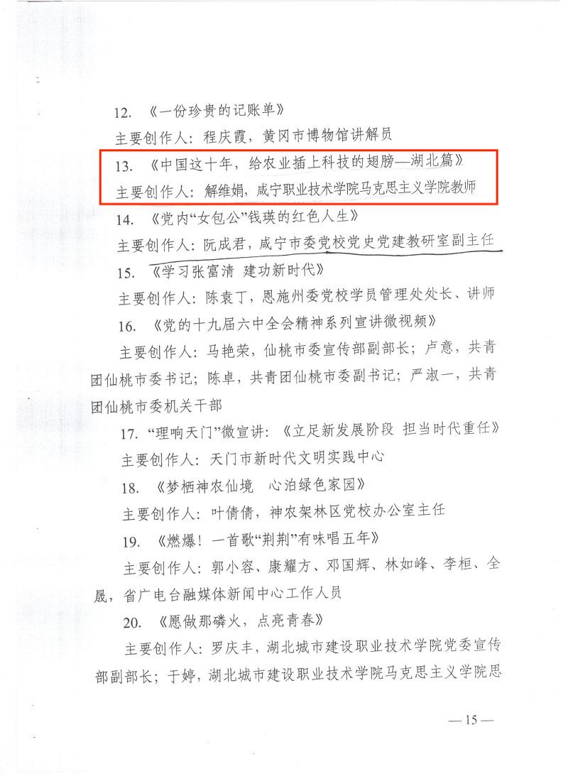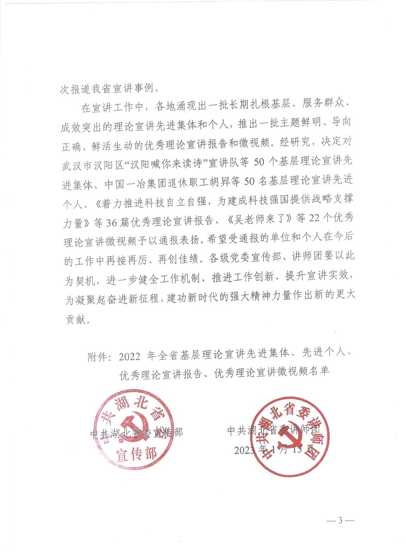 近日,省委宣传部、省委讲师团联合下发《中共湖北省委宣传部 中共湖北省委讲师团 关于2022年全省基层理论宣讲工作先进典型交流活动的通报》(鄂讲文[2023]1号),表彰2022年全省基层理论宣讲先进集体、先进个人、优秀理论宣讲报告、优秀理论宣讲微视频,其中全省基层理论宣讲先进集体50个,先进个人50名,优秀理论宣讲报告36篇,优秀理论宣讲微视频22个。咸宁市委宣讲团共获五项奖励,其中,由我校国产又猛又黄又爽选派的咸宁市委宣讲团成员龚斌安、解维娟分别荣获“先进个人”和“优秀理论宣讲微视频”荣誉。